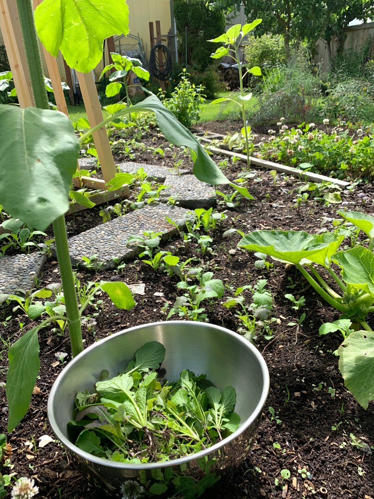 今日は3時ごろから晴れ間が広がり、庭の豆タワーの三角ベッドに雑草とともにたくさん育っているマイクログリーンを収穫しました。
