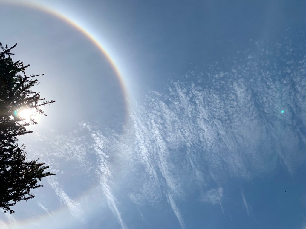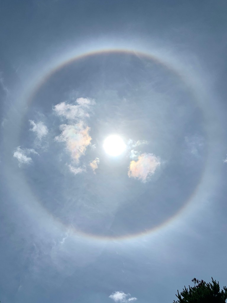 ふと真上を見ると、太陽の周りに虹のリングがかかっていました。わおっ。